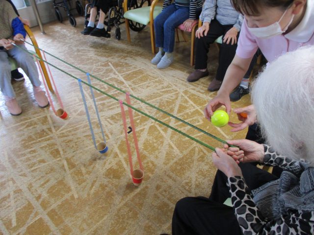 二人で持った2本の棒の上でボールを転がし、カップの中にボールを落とすゲームです。