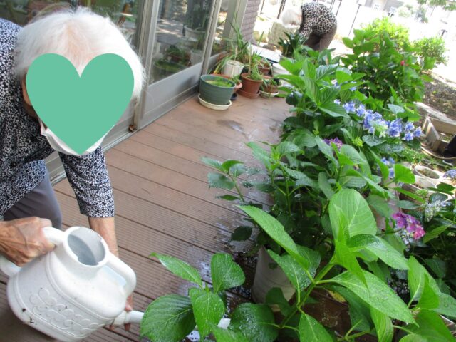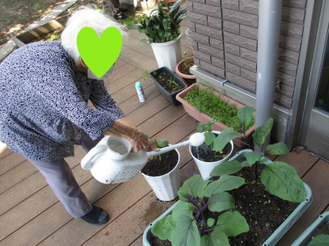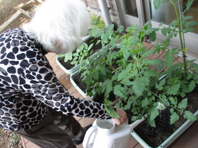 デイサービス利用者様が、野菜と花への水やりを手伝ってくださいます。